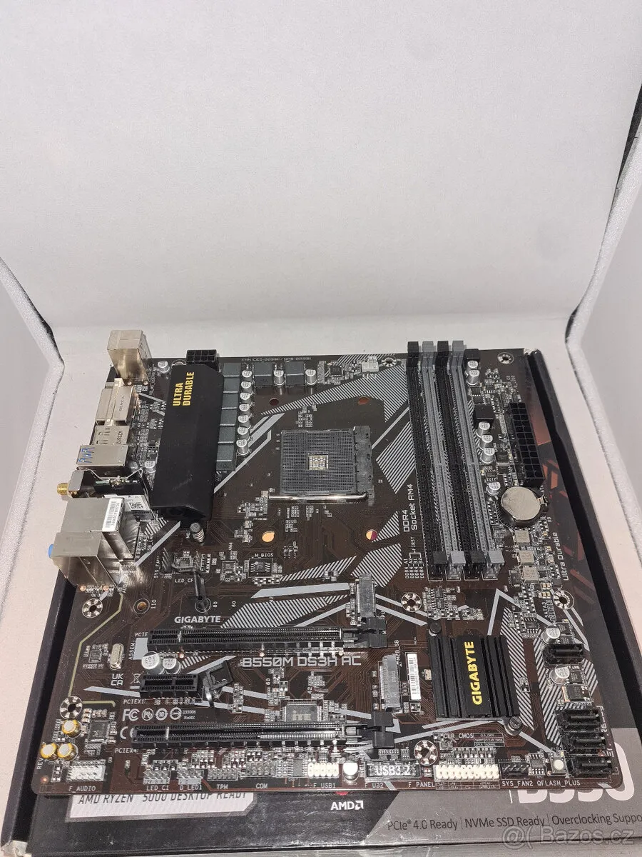 Prodám základní desku GIGABYTE B550M DS3H AC, ve výborném stavu. Ideální pro sestavení herního počítače nebo výkonného stroje na práci – zvládne i náročnější úkoly. Oceníte její spolehlivost a kompatibilitu s moderními procesory. **Specifikace:** * Čipset: AMD B550 (podpora moderních AMD procesorů) * Podpora procesorů: AMD Ryzen™ 5000 Series / Ryzen™ 4000 Series / Ryzen™ 3000 Series (výborná kompatibilita s širokou škálou …